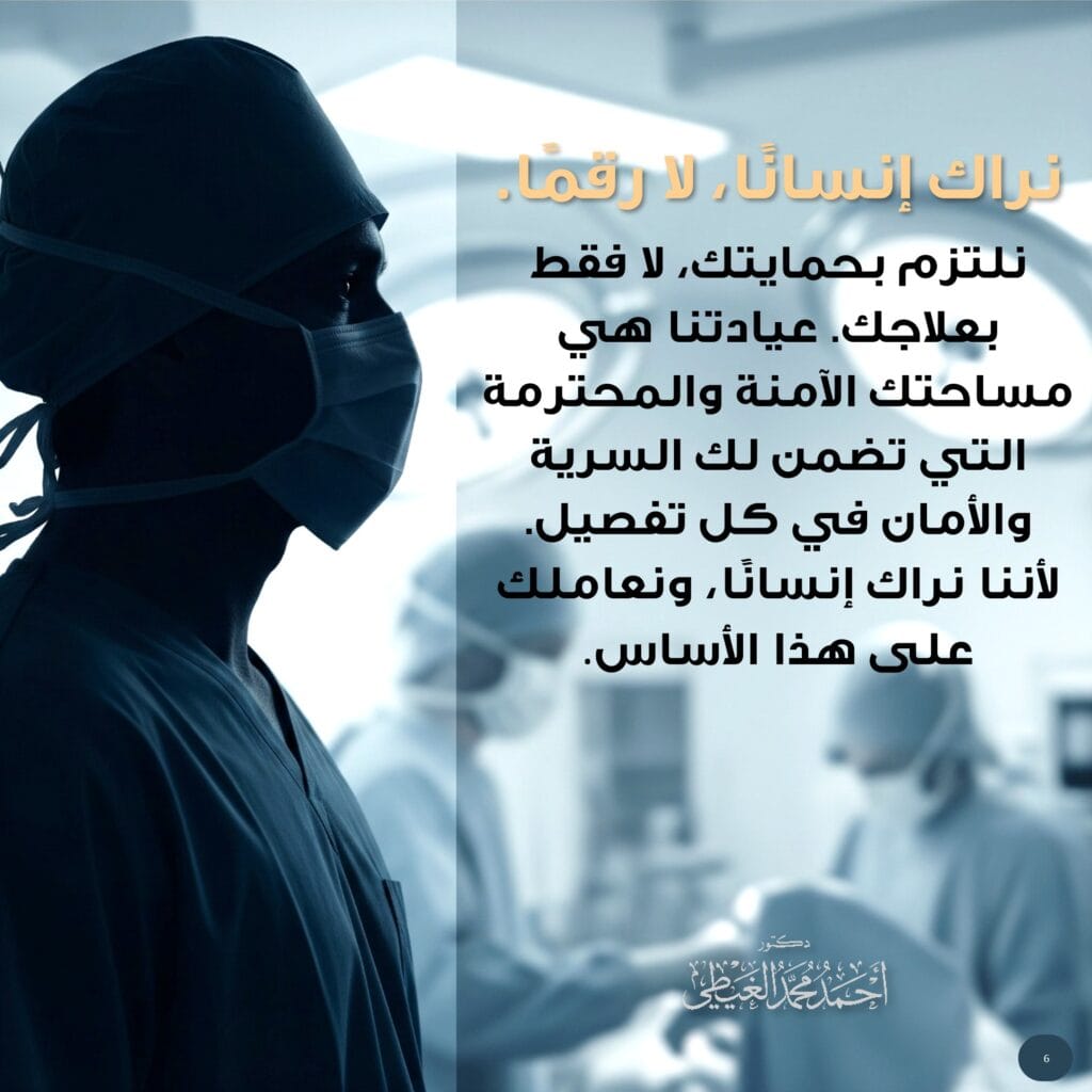 جوهر فلسفته هو أن المريض ليس مجرد “حالة طبية” أو “رقم في ملف”. إنه إنسان له كرامته ومشاعره وقصته الفريدة التي يجب أن تُحترم وتُصان. الشعار الرئيسي “كرامتك أولاً” ليس مجرد عبارة، بل هو التزام عملي يوجه كل قرار داخل العيادة.